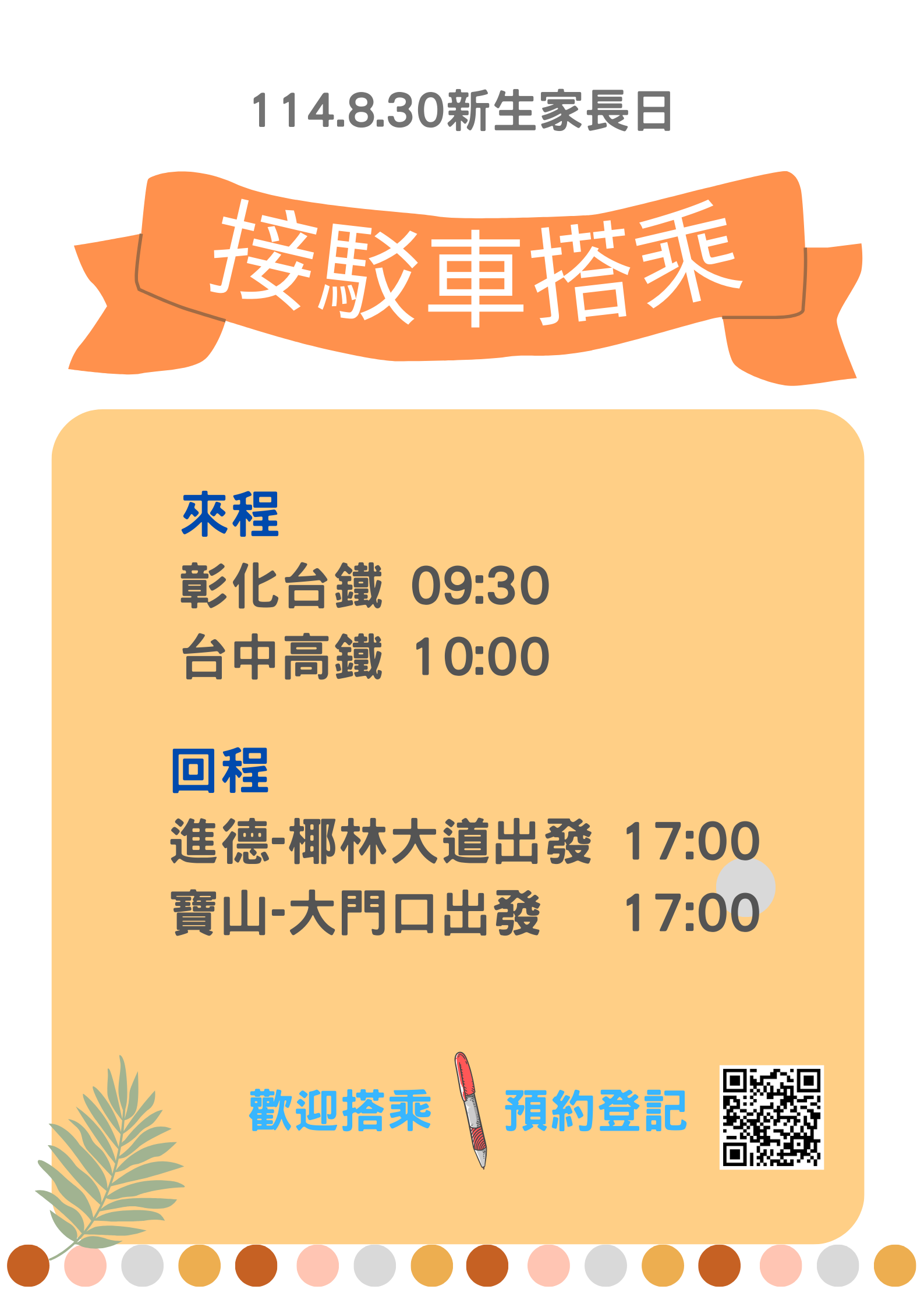 ※接駁車採預約登記制,有需求之新生請先登記,座位登記額滿為止。