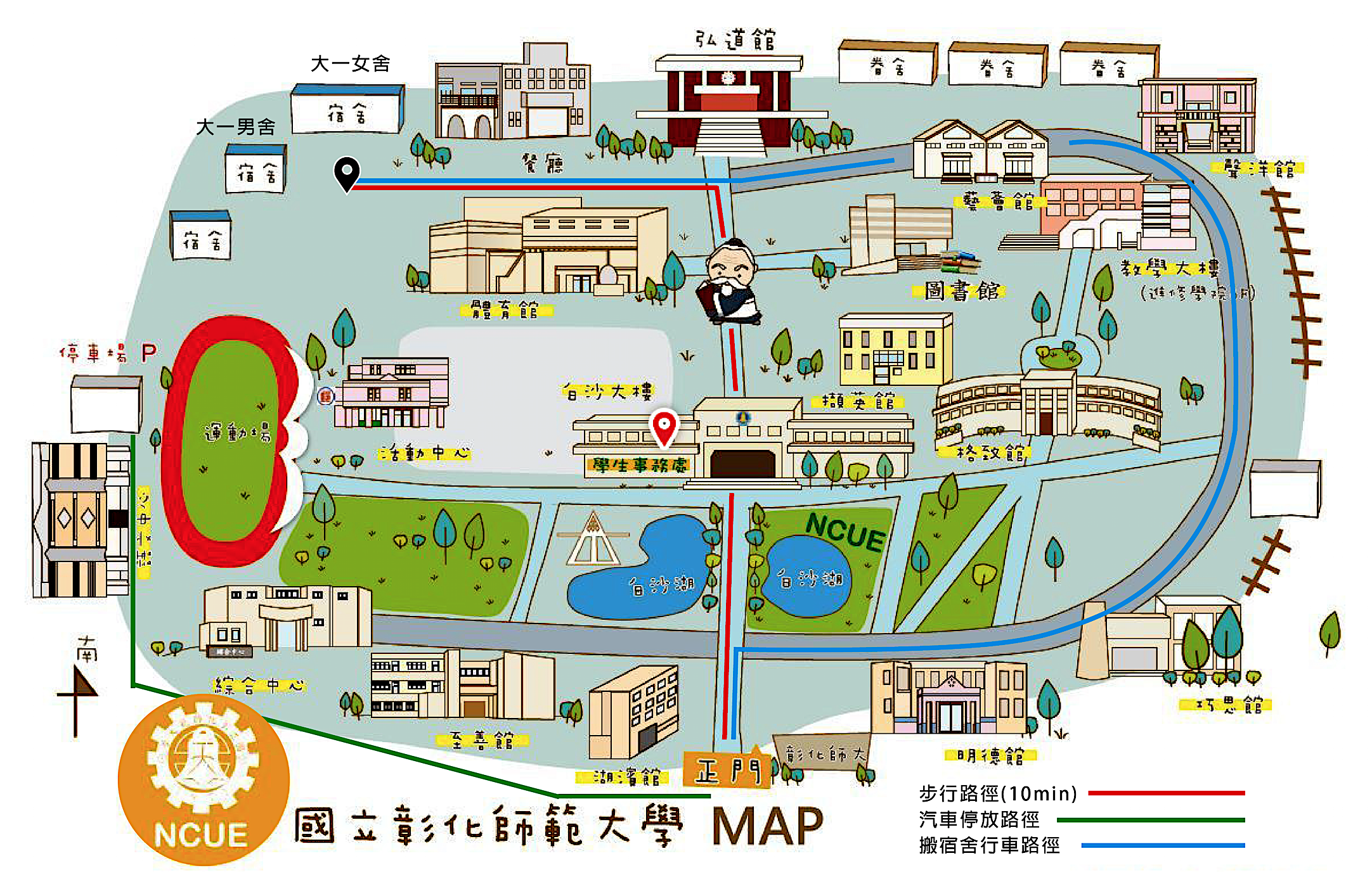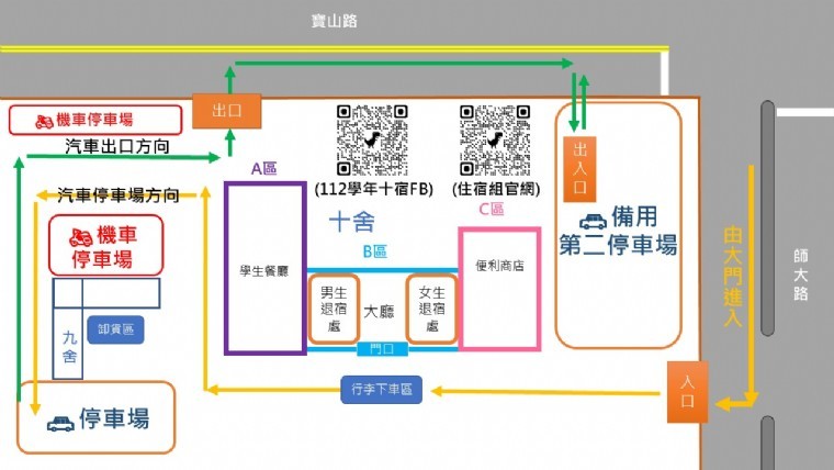 (2)寶山校區(十舍)由宿舍區(師大路口)進入,依指示卸下行李後即須將車輛開往指定區域停放。