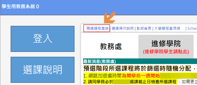 可以在上述頁面查找各課程的選課須知(如通識課程、教育學程、體育、大一英文及大一國文等)、選課時程、超修、上修、停修、