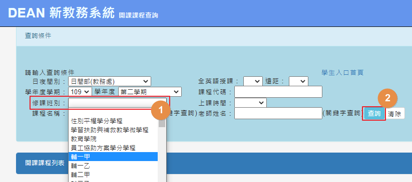 2.下拉選單選擇修課班別→點選查詢按鈕(如下圖),即可出現該班所開設的課程一覽表