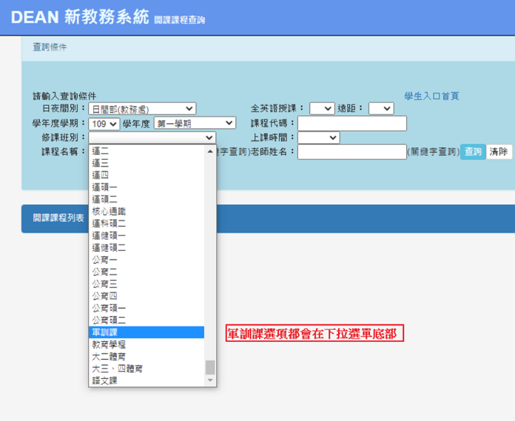 也可以到開課課程查詢,修課班別選"軍訓課",再到選課系統內用代碼選課,如下圖: